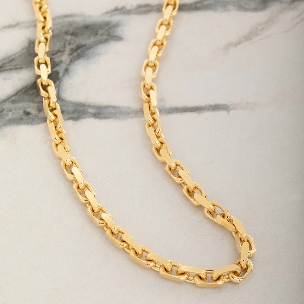 Crafted from solid 14k yellow gold, the 4mm Hermes (Heavy Link) Chain embodies an ancient and masculine style, perfect for the modern man. This gold necklace for men features robust, meticulously crafted links that exude strength and durability, ensuring it stands the test of time. The Hermes Link Chain channels the power and resilience of ancient warriors, making it a bold and commanding statement piece.