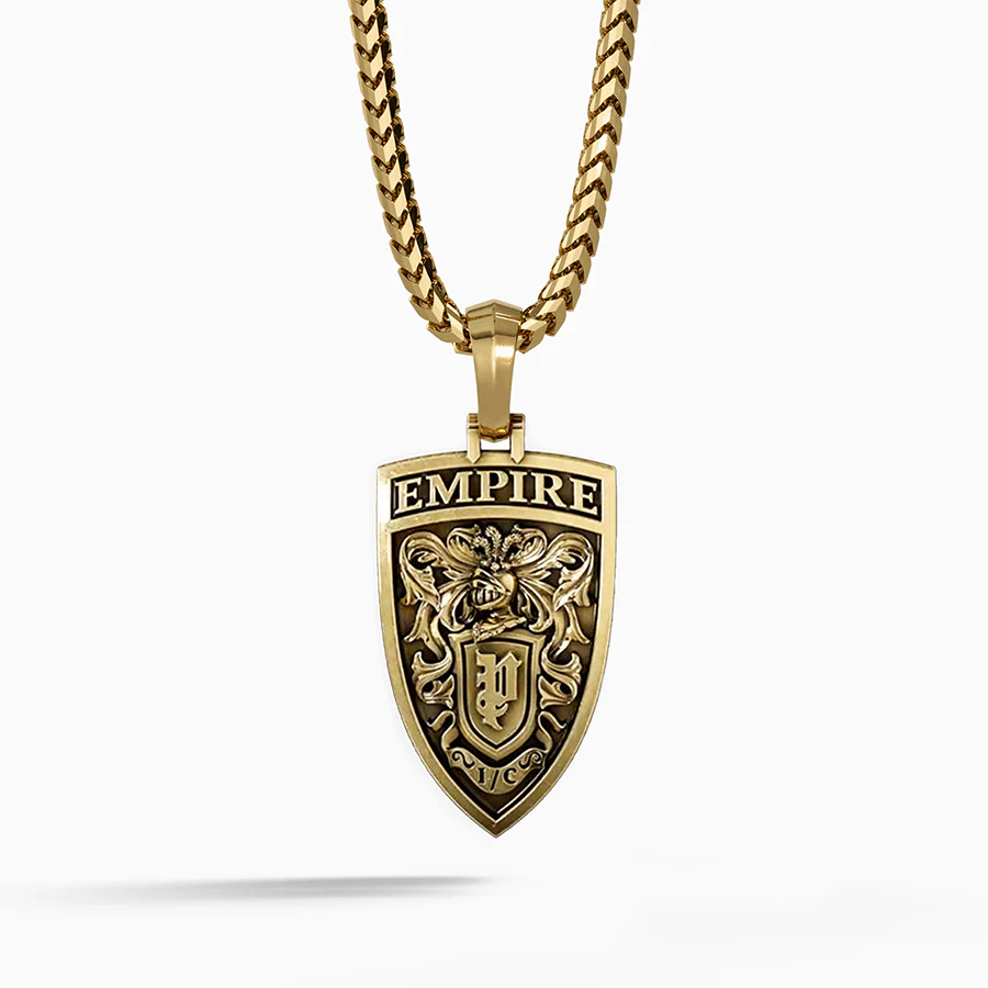 This gold lion pendant, named Empire, depicts a solid gold lion head, roaring within a diamond-encrusted shield and displaying the might and power of a ferocious born leader for all to behold. It is a powerful reminder that a beast and a king lives within us all, and its power must be unleashed in the battle to forge our Empires.