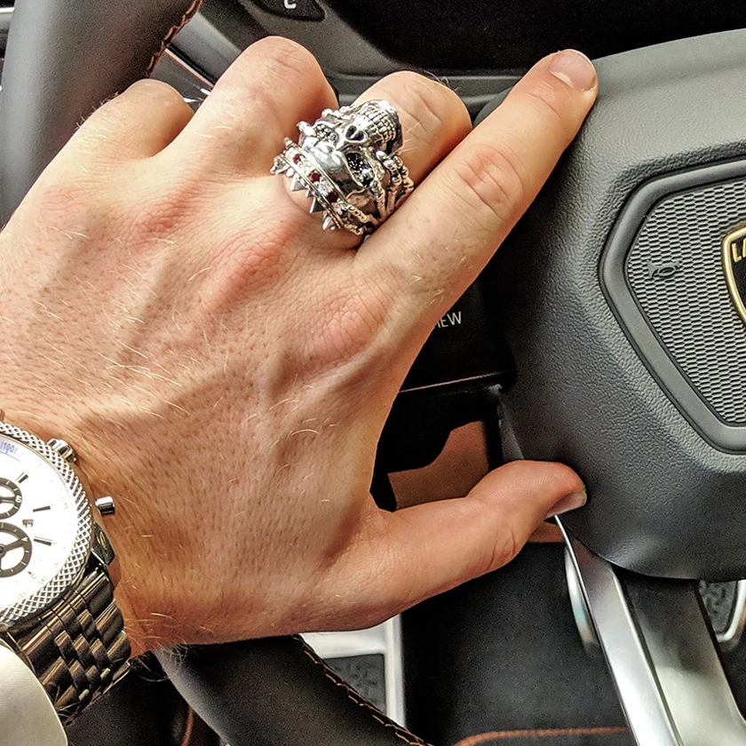Our unique silver skull ring shows the crowned head of the prior king, displayed for all to see in the hands of the Usurper.Ā This solidĀ sterling silver mens ring is handcrafted by our artisan jewelers in the USA. The crown featuresĀ 0.50 carats of lab-grown white diamonds andĀ 0.50 carats of lab-grown red rubies. Additionally,Ā 0.35 carats of black spinelĀ are masterfully pave' set in the eyes of theĀ silver skull.