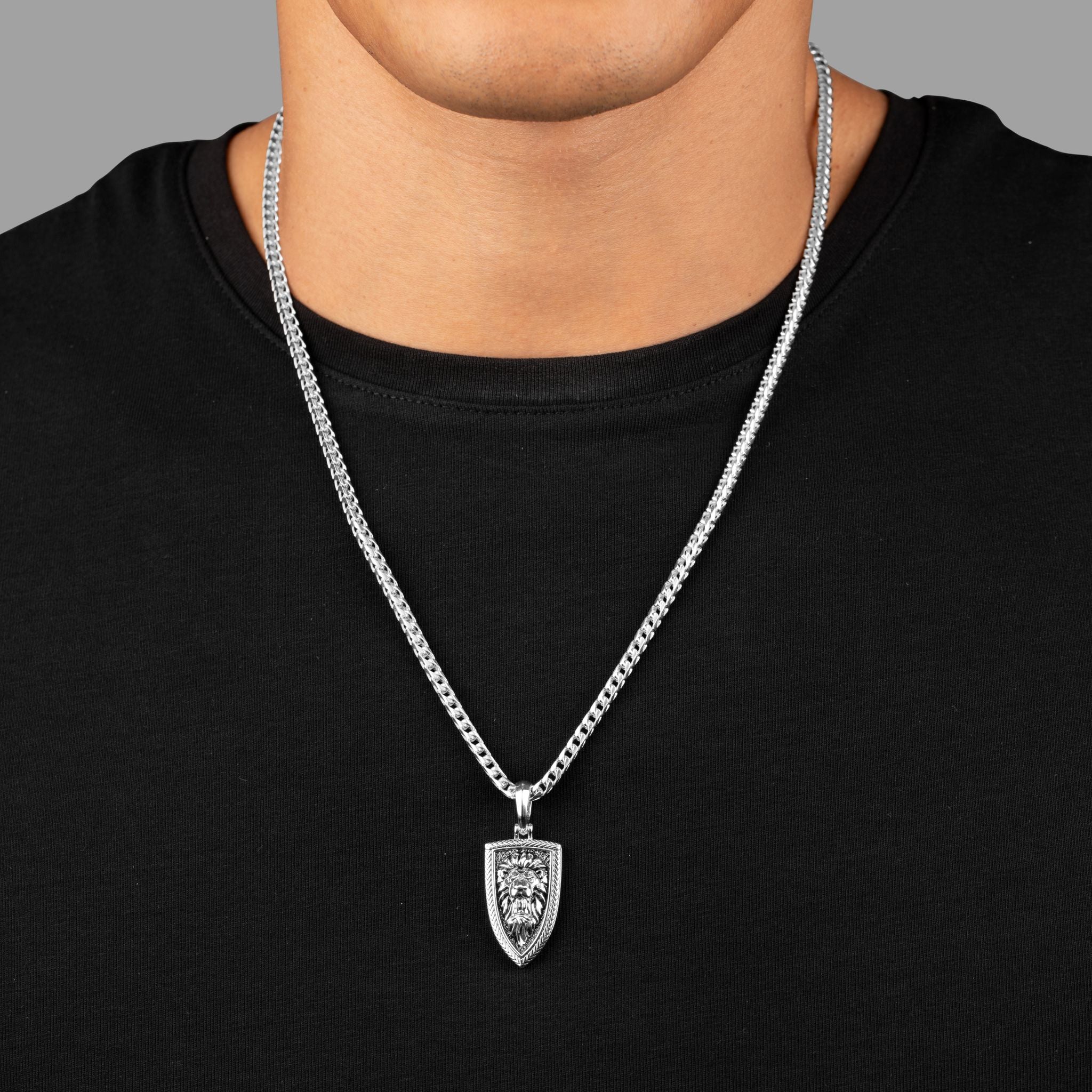 This silver lion pendant, named Empire, depicts a sterling silver lion head, roaring within a shield and displaying the might and power of a ferocious born leader for all to behold. It is a powerful reminder that a beast and a king lives within us all, and its power must be unleashed in the battle to forge our Empires.